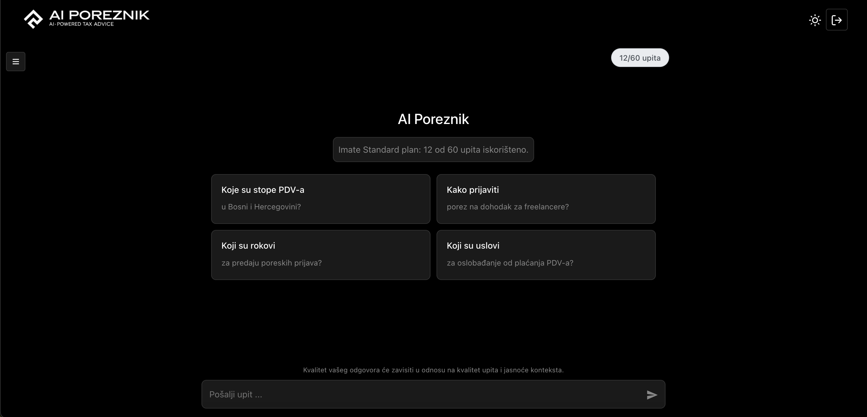 AI Poreznik je prvi porezni asistent baziran na vještačkoj inteligenciji u Bosni i Hercegovini. Pruža brze i pouzdane odgovore na sva vaša porezna pitanja, pomaže vam da razumijete kompleksne porezne propise i optimizujete vaše porezne obaveze. Naša platforma daje trenutne odgovore na porezna pitanja za 24/7 podršku i zadovoljstvo korisnika.